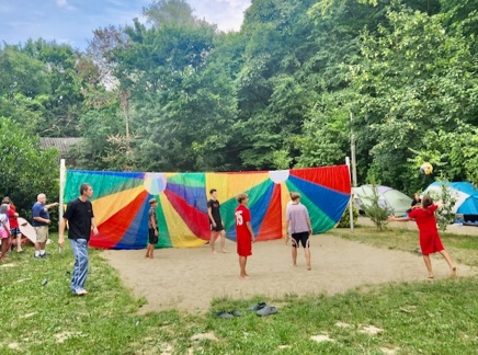 The games program required constant adaptation, but the results were magical. “Double blind volleyball” with colorful parachutes hanging over the net created hilarity and teamwork. Water balloon launches with slingshots turned a rainy day into an adventure. “Color ball resurrection freeze war”—an inventive dodgeball variation played within a human-formed square—had children strategizing and laughing together.