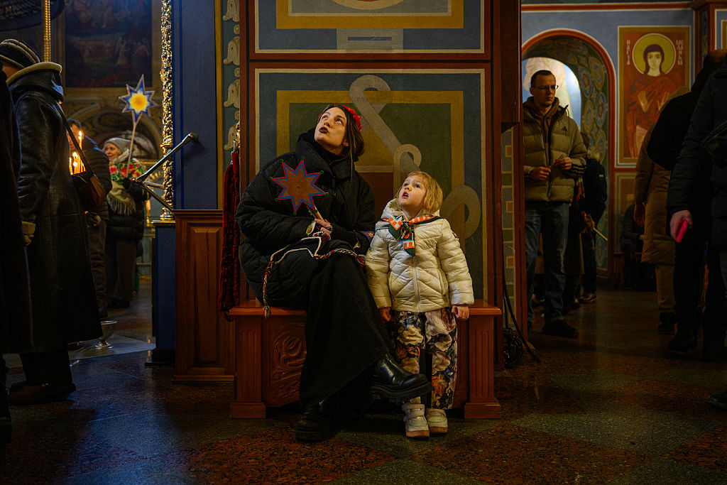 Christmas paused by sirens: A woman holds her daughter inside Kyiv’s St. Michael’s Golden-Domed Monastery after an air raid alarm halted a Christmas procession. Caroling Stars waited in silence as worshippers measured celebration against survival. (Elise Blanchard/Getty Images)