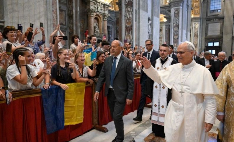 Pope Leo XVI greets Ukrainian Greek Catholics at St. Peter’s Basilica in the Vatican. (The Holy See)