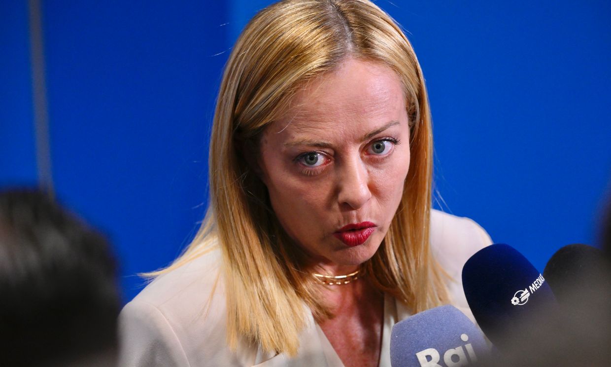 Italy’s Prime Minister Giorgia Meloni speaks to the media during a NATO leaders summit in The Hague, Netherlands. (John Thys / AFP)