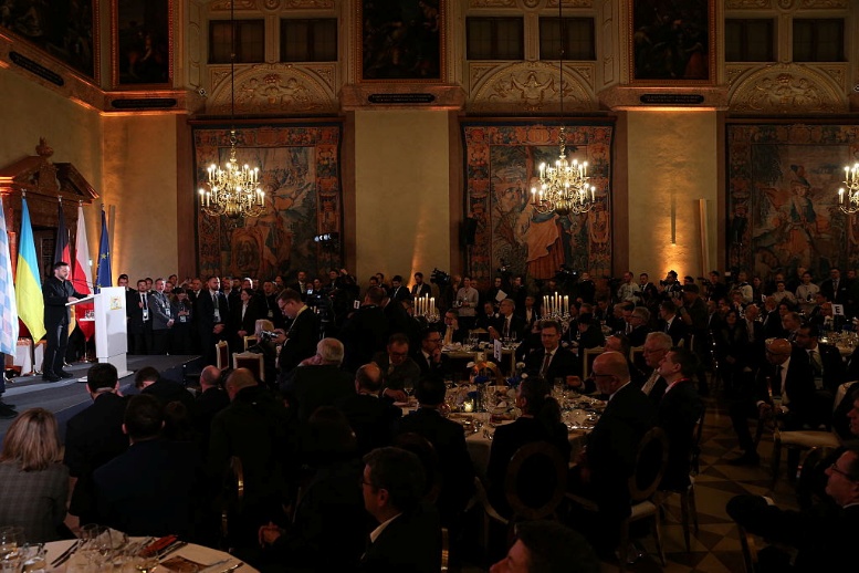 President Volodymyr Zelensky speaks during dinner at the 62nd Munich Security Conference (MSC) and Ewald-von-Kleist Award Ceremony, in Munich, Germany. While the award usually goes to a single person, MSC Chairman Wolfgang Ischinger said this year the recipients are the people of Ukraine for their courage and fortitude in enduring nearly four years of Russia’s war. (Gisela Schober/Getty Images)