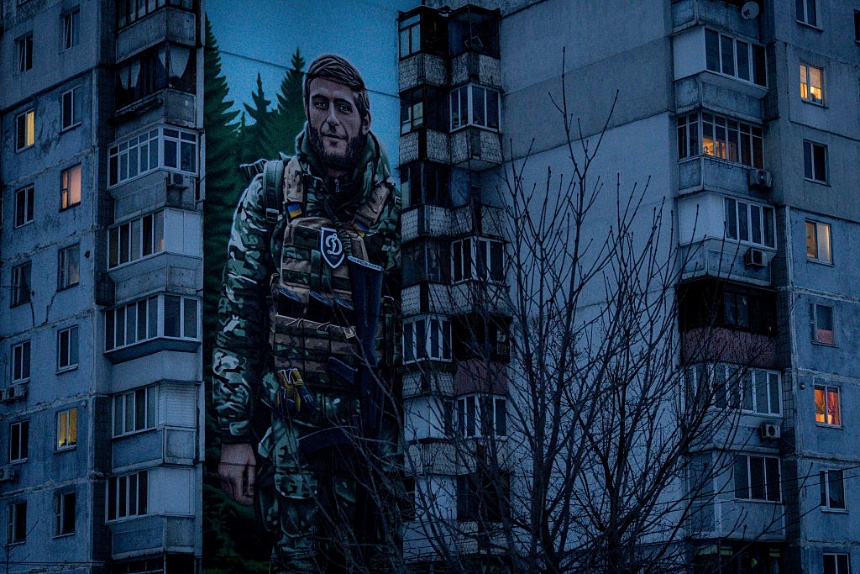 Apartments are illuminated at a building suffering from limited electricity and painted with the mural of a fallen Ukrainian soldier in Kyiv. As full-scale war approaches its fourth anniversary, Ukrainians have been forced to cope with subzero temperatures with widespread heat and electricity outages caused by Russia’s relentless attacks on its energy infrastructure. (Chris McGrath / Getty Images)