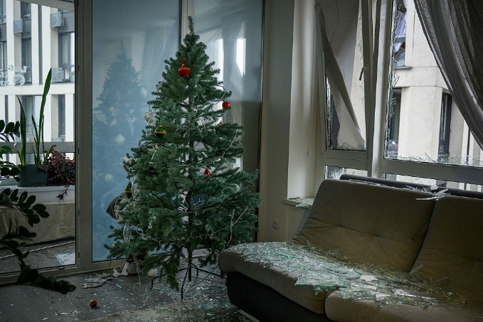 Windows are shattered in an apartment badly damaged during Russian strikes in Kyiv. Russia attacked Ukraine with hundreds of missiles and drones on Saturday, killing two people in Kyiv and surrounding areas, and injuring at least 46 others, according to authorities. (Elise Blanchard/Getty Images)
