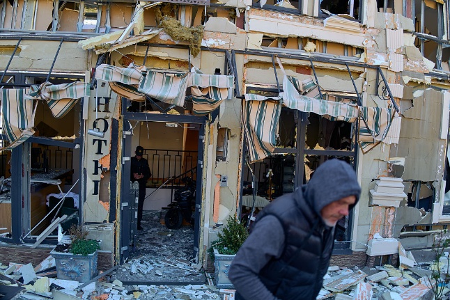 A security guard stands watch at the entrance of a hotel destroyed by a Russian Shahed drone strike in Odesa. (Pierre Crom/Getty Images)