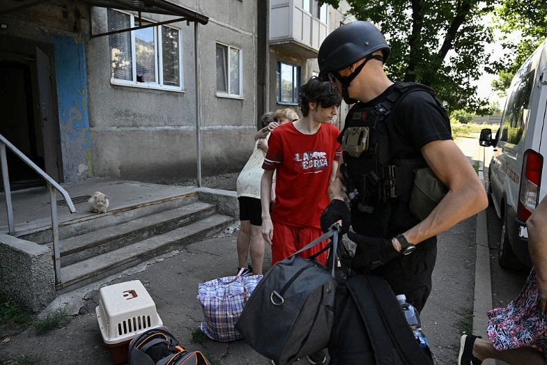 An evacuation team member from the East SOS Charity Foundation (R) helps residents to load their belongings onto a bus evacuating them from the town of Dobropillia, Donetsk Oblast. (Genya Savilov / AFP via Getty Images)