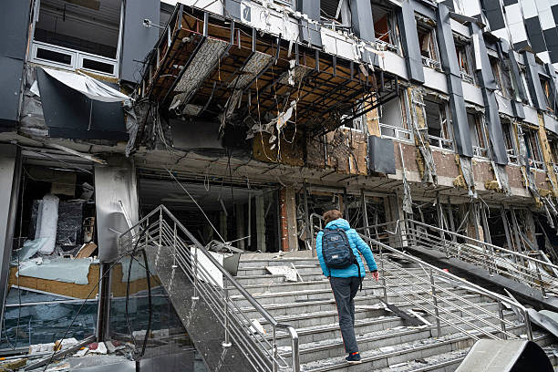 Morning in Kyiv’s Podilsky district: A woman climbs stairs in a business center that Russian drones struck hours earlier. The night’s attack left high-rises gutted, a kindergarten damaged, and office workers returning to shattered glass and twisted metal. This is how Ukrainians go to work on day 1,338. (Danylo Antoniuk/Ukrinform/NurPhoto via Getty Images)