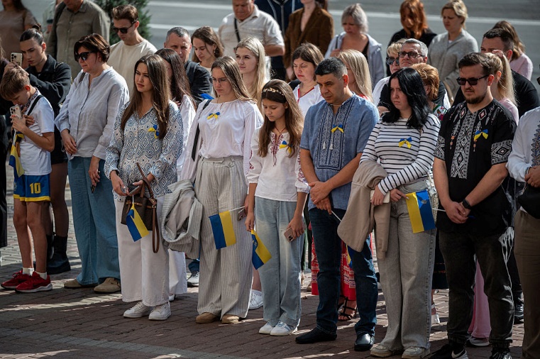 Ukrainians celebrate the Day of the National Flag of Ukraine in Kyiv. (Danylo Antoniuk/Anadolu via Getty Images)