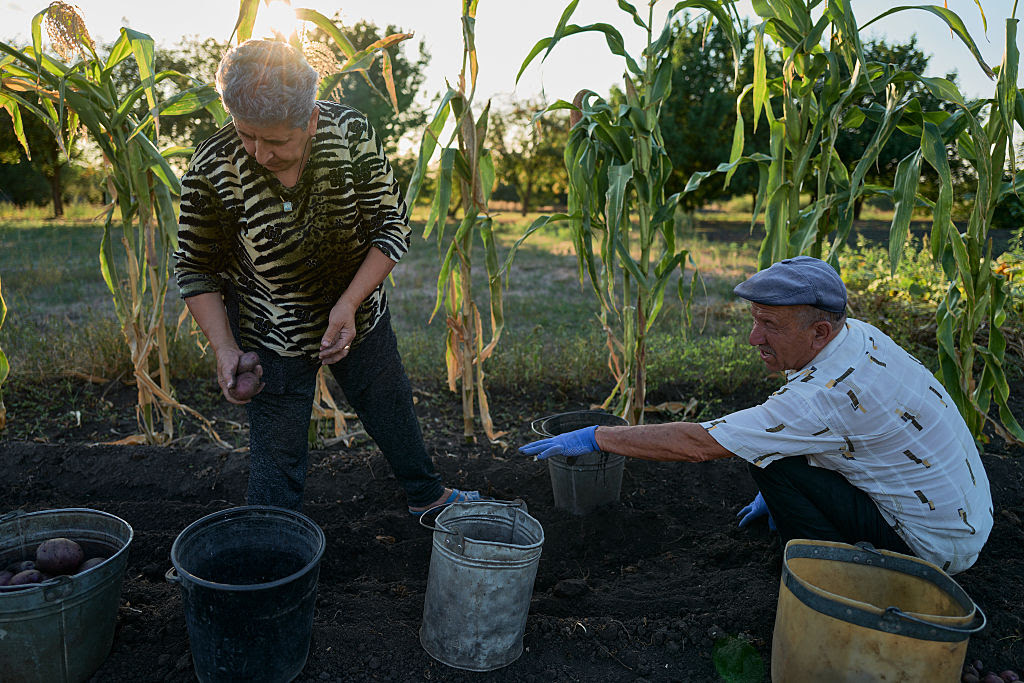 Olga (L) and Zabit (R), Ukrainian citizens of Azerbaijani origin who fled Soviet crackdowns during Azerbaijan’s independence uprising in 1990, harvest potatoes in their garden plot on Aug. 21, in Sloviansk, Ukraine. Sloviansk is the city where the war began in 2014, marked by its occupation by Russian militias led by Igor Strelkov, also known as Girkin. The town is located in Donetsk Oblast, a Ukrainian region cited in peace-talk discussions involving U.S. President Donald Trump and Russian President Vladimir Putin over a potential front-line freeze and territorial exchanges. (Pierre Crom/Getty Images)