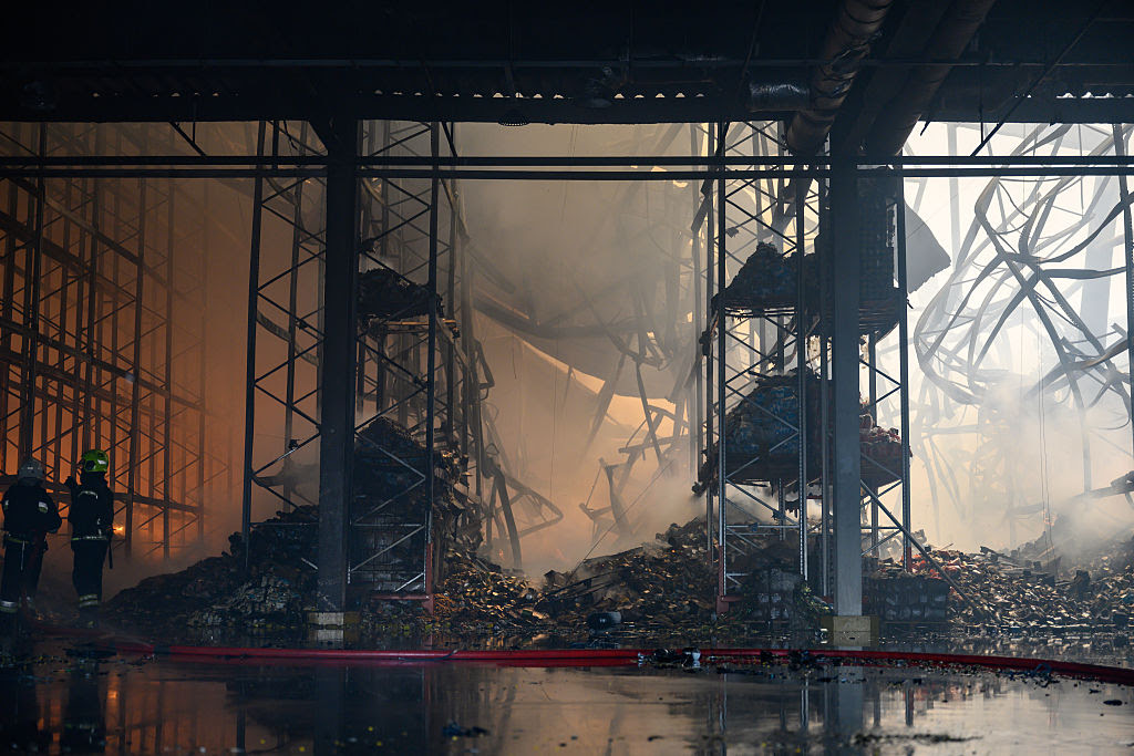 Ukrainian firefighters battle a blaze at a food warehouse caused by two Russian ballistic missiles in a midday strike that killed one security guard in Kharkiv, Ukraine. (Scott Peterson / Getty Images)
